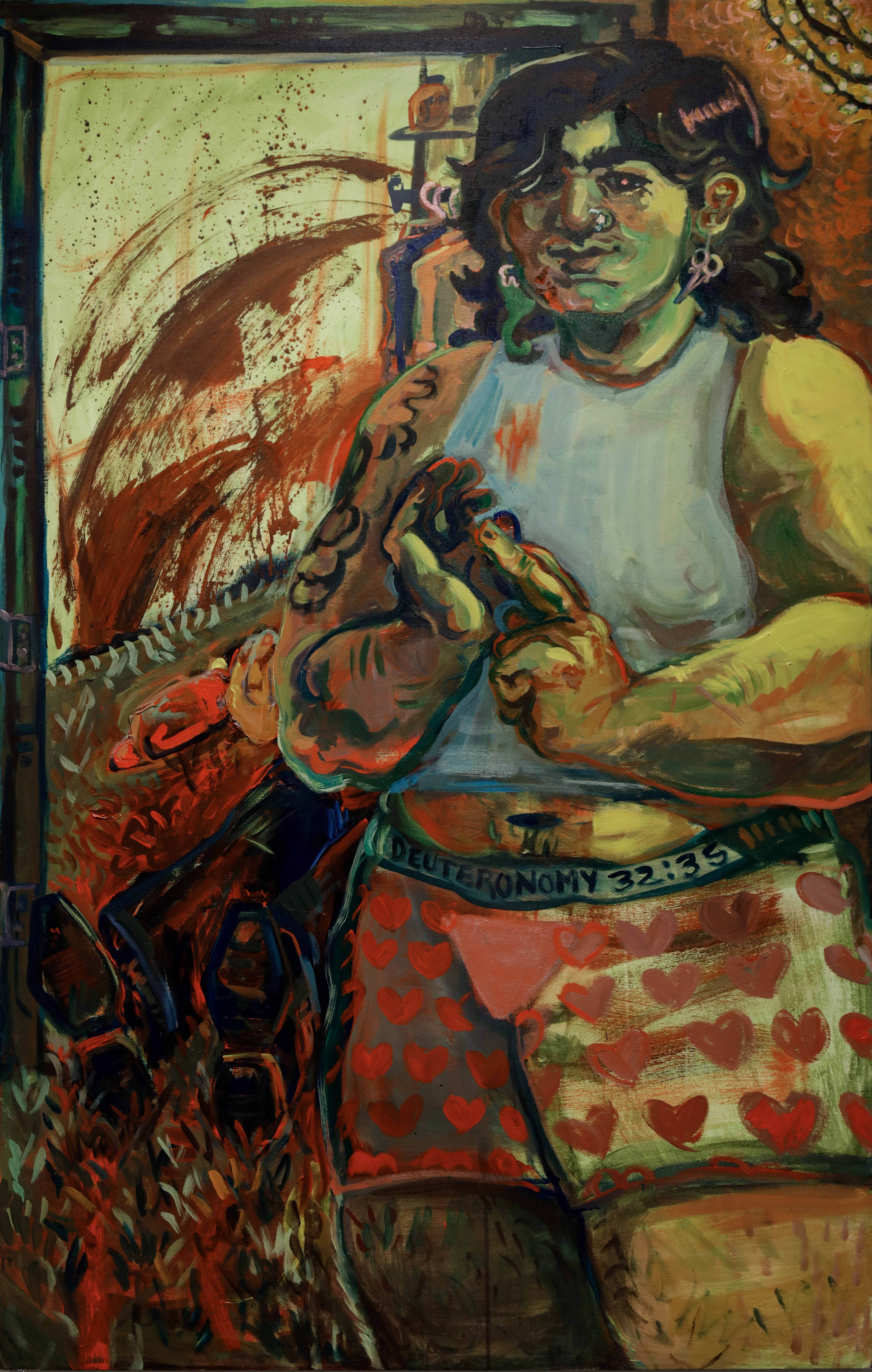 Leila Monahan is a Florida-born artist whose paintings communicate queer personhood informed by historical context and lived experience. They manifest a tug-of-war between past and present in layers of paint, as working in acrylic paint allows for quick layers and packed with information and expression. Confrontational blocky figures and intense colors immerse the viewer in the space of their paintings. They seek to convey experiences and moods that will either evoke understanding or revulsion, no in-between.